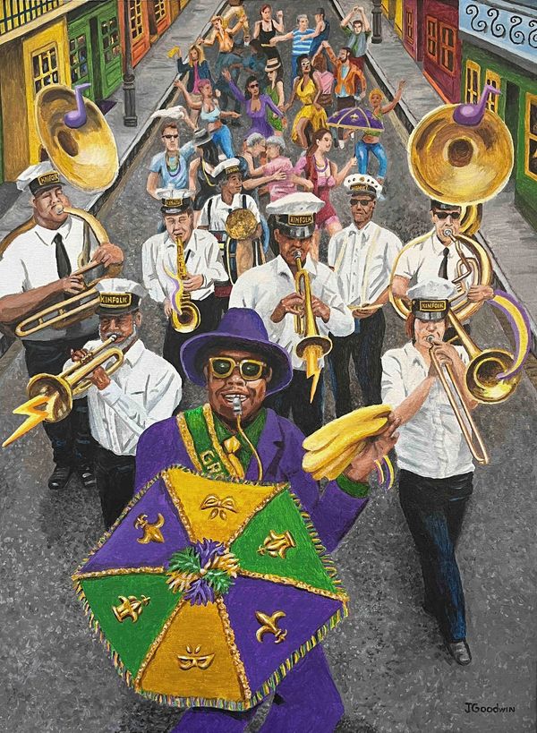 A lot of my art is inspired by music - all kinds of music - and I like to visualize it in bright colors and moving shapes, while also paying respect to the musicians themselves. Although I'm partial to the Blues, I'm also fascinated with cultural symbols of all sorts, images from Louisiana life, and other colorful subjects.