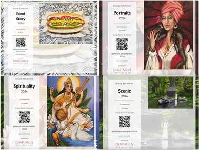 Four of my paintings were featured in monthly online group exhibitions by the international art organization Gallerium, each with different themes. "Chicago Style" in Food Story, "Marie Laveau" in Portraits. "The Bayou Goodbye" in Scenic. and "Saraswati" in Spirituality 2024. Details about each of these can be found in my galleries.