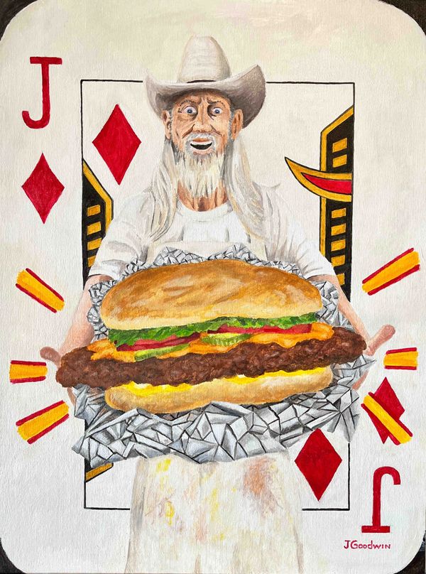 Ol’ Jack Sorrells was a real card. He told jokes, sang, and played guitar for his customers all while cooking massive hamburgers that were just as outrageous as he was. “Best burgers around, throw them ‘taters on the ground!” he liked to say. This is my tribute to Arkansas's legendary Hamburger King – The Jack of Diamonds! More info is listed in the Miscellaneous Gallery.