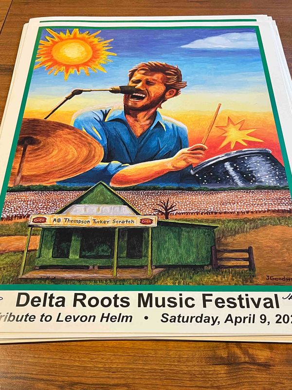 The Delta Roots Music Festival chose me to be their first official artist and commissioned me to paint Levon Helm, a native of nearby Turkey Scratch, as a tribute they could use on their posters and T-shirts for the 2022 festival. They had me sign and number an edition of 50 and they sold unsigned posters as well - it was such an honor to be chosen for this as a long-time fan of his music. They held a poster signing event at the Delta Dirt Distillery the night before the festival , which featured a full day and night of great music on Saturday, April 9th.