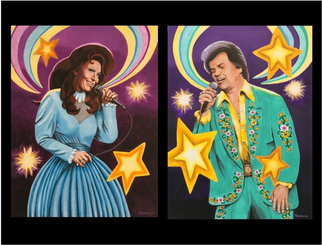 Conway Twitty & Loretta Lynn Set - 18 X 24 each. Loretta, “the coal miner’s daughter”, and Conway were often duet partners and had 12 top ten singles and 5 number one hits together on the Billboard Country Music charts. The set of originals is available for $800 or a set of prints is available for $100.